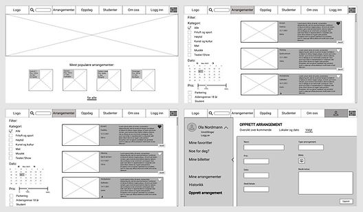 Vi skisserte flere layouts med inspirasjon fra forskjellige eksisterende nettsider. Deretter lagde vi wireframes med ulike strukturer, samt forslag til logo.